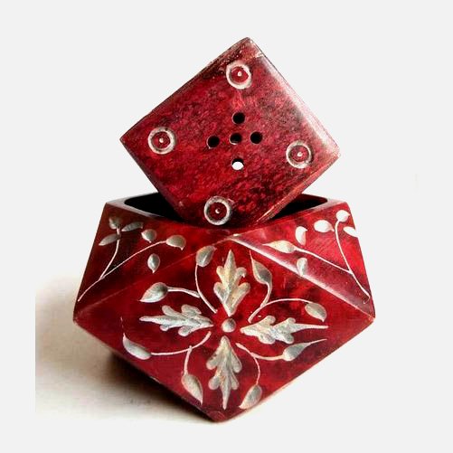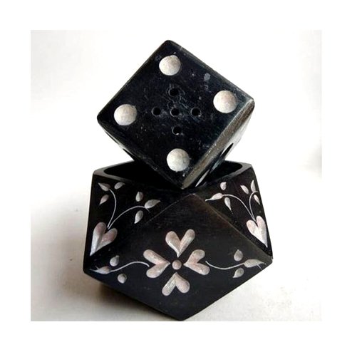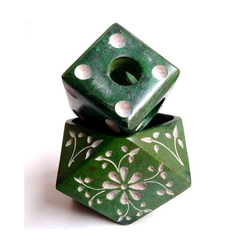 This appears to be a handcrafted, multi-purpose holder made from stone, likely soapstone or marble. It can function as both a candle Holder and an incense stick holder. The cube-shaped inner piece can be placed inside the outer structure for different uses. The intricate carving and openwork design add to its aesthetic appeal. Such holders are often used in religious or decorative contexts.
