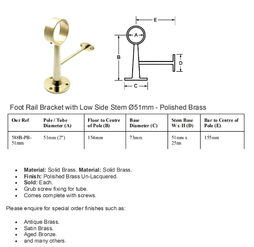 Brass Foot Rail Bracket with Low Side Stem Polish Brass Finish 51mm #9247