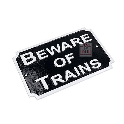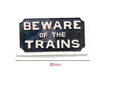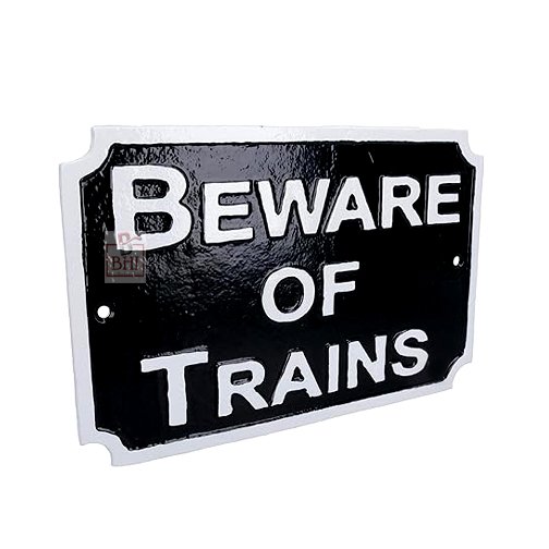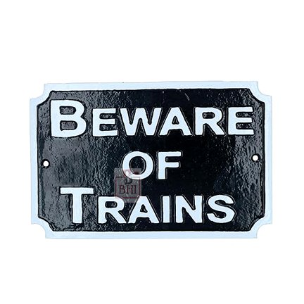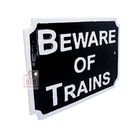Cast Iron “BEWARE OF THE TRAINS” Sign Plaque Door Wall Fence Post Cafe Shop Pub Hotel Bar Work B/White Vintage Finish