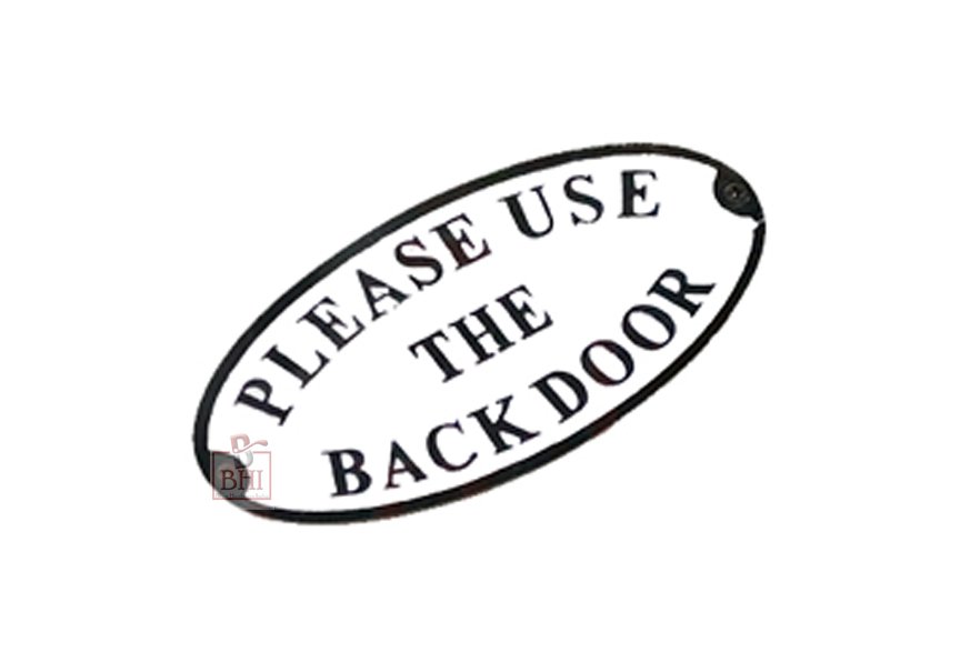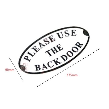 Cast Iron “PLEASE USE THE BACK DOOR” Sign – Printed contemporary design. Easy to read, informative polite notice for your guests/customers. Global shipping. Cast Iron “PLEASE USE THE BACK DOOR” Oval Sign Plaque Door Wall Fence Post Cafe Shop Pub Hotel Bar Work B/White Vintage Finish