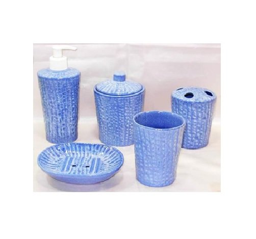 This is a ceramic bathroom set, typically used to hold toiletries. The set usually includes items such as a soap dispenser, toothbrush holder, tumbler, soap dish, and a small storage container. These items are used for personal hygiene and organization in the bathroom.