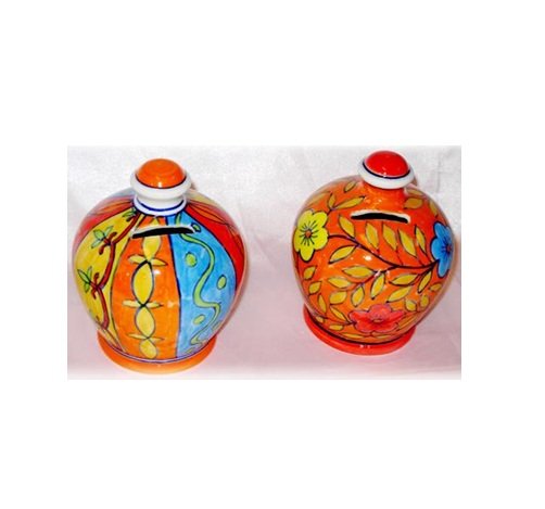 This ceramic bank is in the smooth and shiny surface colored coating. It is a good decoration in the room.
