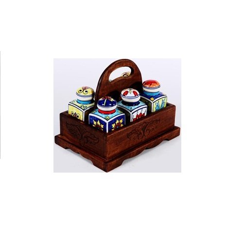 This is an Exclusive Storage Container with Wood Stand. It can be used for storing a variety of items, such as spices, herbs, or other small kitchen items. The containers are made from ceramic and have decorative lids. The wooden stand provides a convenient way to keep the containers organised and accessible. The ceramic containers are durable and easy to clean, while the wooden stand adds a touch of elegance to any kitchen.