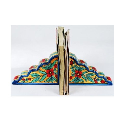 The bookends in the image appear to be made of ceramic and are decorated with a floral design.