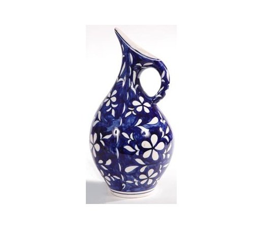 This is a ceramic jug, often used for serving liquids like water, milk, juice, or other beverages. It can also be used for storage purposes. Additionally, it can serve as a decorative piece or a vase for flowers. The jug’s design, with its blue and white floral pattern, adds an aesthetic touch to any setting. These types of jugs are often handmade by artisans and can be part of traditional pottery styles.