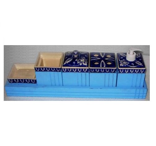 This is a ceramic condiment set, likely for use in a kitchen or dining setting. It includes several containers, possibly for holding different types of spices, sauces, or other condiments. The set is characterised by its blue and white color scheme and decorative patterns. The design appears to be hand-painted or crafted, giving it a unique and artisanal look. The set also includes a dispenser, which is likely for liquid soap or lotion.