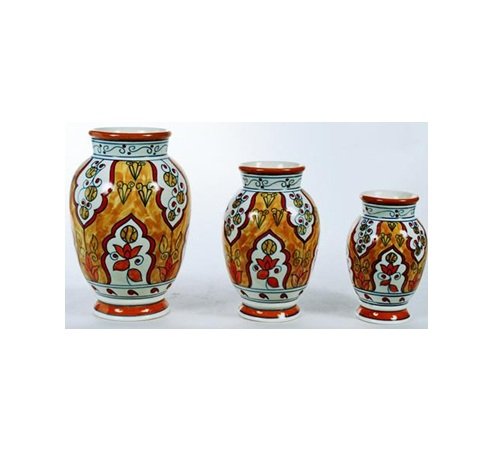 These are Decorative vases, a traditional Russian folk art style known for its vibrant colors and floral patterns.It features red, gold, and black colors. The red symbolises beauty, gold represents wealth, and black is associated with the earth. These vases are often made of wood and hand-painted. The style is characterized by curved lines, small flowers, berries, and leaf motifs.