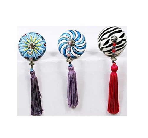 This could be decorative tassel pulls, possibly for drawers or cabinets. They are characterized by their round, patterned tops and long, dangling tassels.