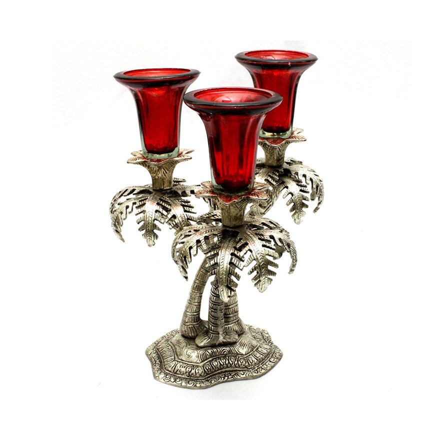 Triple Palm Candle Stand with Hand-Carving (Red)