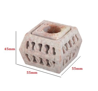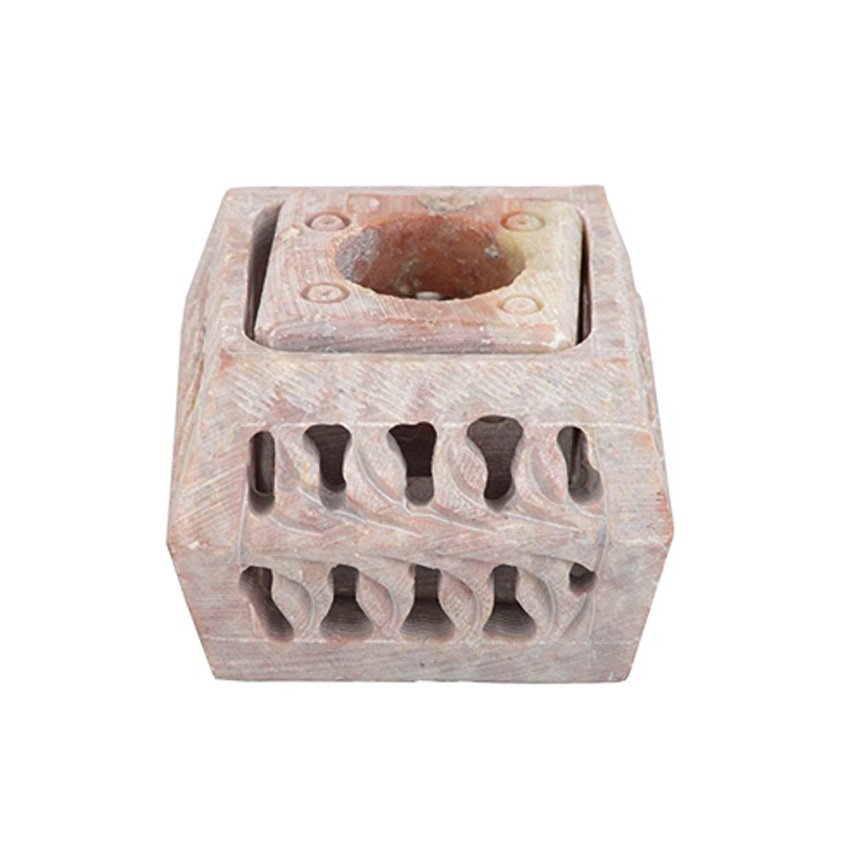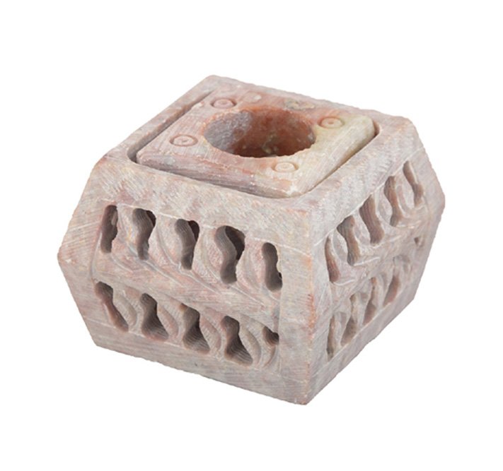 This appears to be a handcrafted, multi-purpose holder made from stone, likely soapstone or marble. It can function as both a candle stand and an incense stick holder. The cube-shaped inner piece can be placed inside the outer structure for different uses. The intricate carving and openwork design add to its aesthetic appeal. Such holders are often used in religious or decorative contexts.