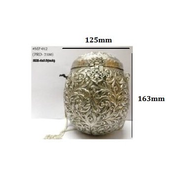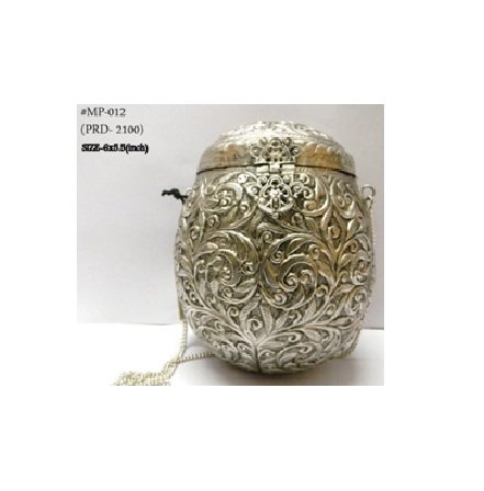 Handmade clutch with Beautiful Hanging silver balls, Bag is complete made from Brass Metal .Handmade Vintage Hand Clutch made from Brass Metal . A basic Brass metal object is first designed and fine carving is done on it by hand. The process is finally completed by oxidization and polishing. Wall of the inner space is also fixed with soft velvet to protect your items. Such metal clutch bags is a very old art and but they are recently been introduced as a fashion statement.