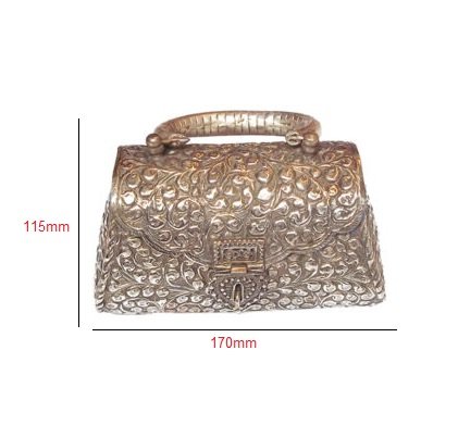 Handmade clutch with Beautiful Hanging silver balls, Bag is complete made from Brass Metal .Handmade Vintage Hand Clutch made from Brass Metal . A basic Brass metal object is first designed and fine carving is done on it by hand. The process is finally completed by oxidization and polishing. Wall of the inner space is also fixed with soft velvet to protect your items. Such metal clutch bags is a very old art and but they are recently been introduced as a fashion statement.