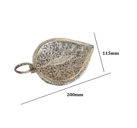 The object in the image is a decorative leaf-shaped dish, likely made of metal such as brass or Silver Antique, featuring intricate floral or vine-like engravings and a small handle.