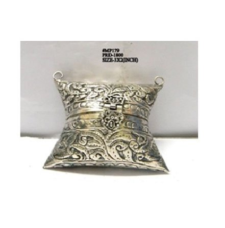 Handmade clutch with Beautiful Hanging silver balls, Bag is complete made from Brass Metal .Handmade Vintage Hand Clutch made from Brass Metal . A basic Brass metal object is first designed and fine carving is done on it by hand. The process is finally completed by oxidization and Silver Polishing. Wall of the inner space is also fixed with soft velvet to protect your items. Such metal clutch bags is a very old art and but they are recently been introduced as a fashion statement.