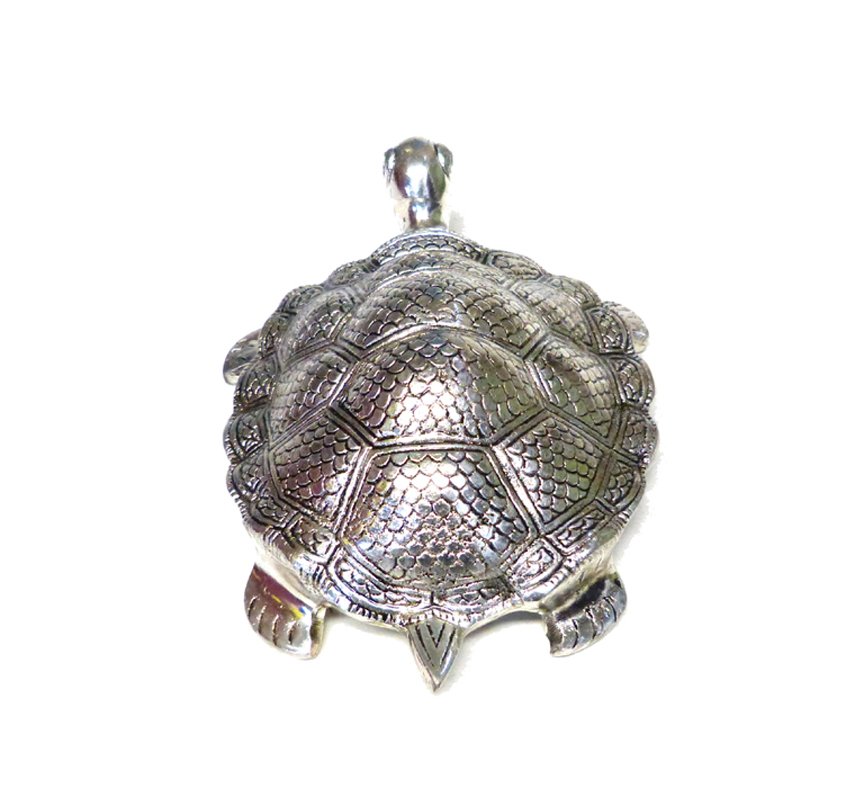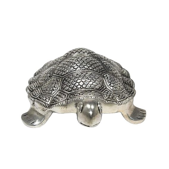 The object in the image is a decorative tortoise figurine, typically made of metal with a silver finish, often referred to as a “Silver Tortoise” or “White Metal Tortoise”.