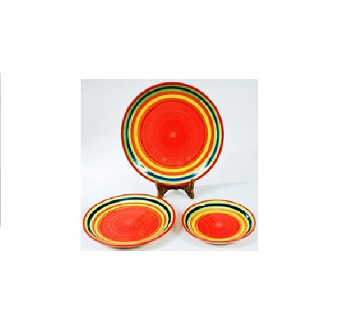 The image shows a set of Royal dinner plates. These plates are characterised by their vibrant, concentric rings of colour, typically featuring red, yellow, and blue, with a glossy finish. They are made of ceramic and are suitable for everyday use.