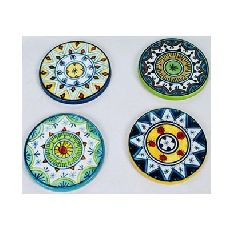 The image shows a set of ceramic coasters, likely used to protect surfaces from condensation and heat. These coasters are often made from terracotta and are heat resistant. They can come in various designs and materials, including ceramic, felt, cork, marble, resin, and wood. Coasters are designed to absorb moisture and prevent stains on furniture. The image shows a set with a floral pattern, which is a common design for these types of coasters.