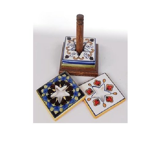 Set of ceramic coasters with a wooden holder these coasters are often used to protect surfaces from the heat and moisture of drinks the holder helps to keep the coasters organized and easily accessible.