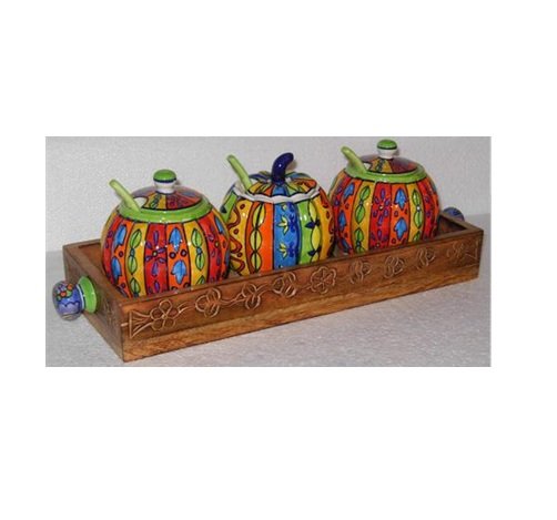 Multi-Purpose Ceramic Pickle & Chutney Jar Set & Holder Multicolor Hand-Painted Pickle Container for Kitchen Achar Jar Chutney Jam Jars