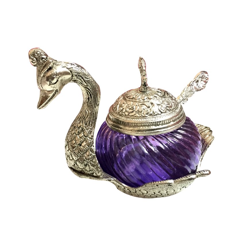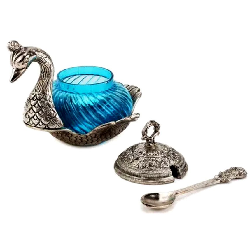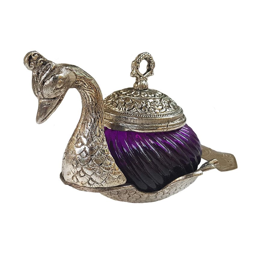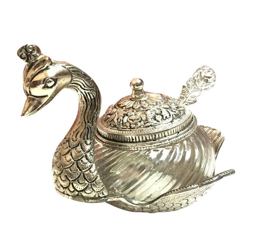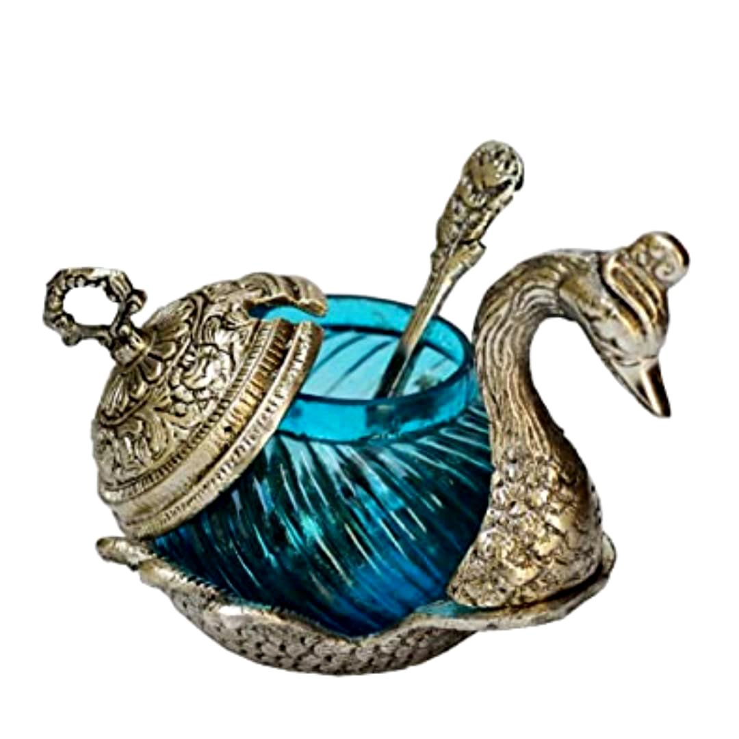 Silver Metal Duck Shape Single Bowl With Tray Set, Glass Bowl kitchen Stroge, Multi Purpose, Sugar Bowl,Masala Bowl Traditional Handicraft Decorative Gift Item Platter Burni Showpiece, Gift item, Wedding,New Year, Christmas, Marriage & uesd in various ocassions.