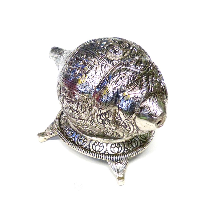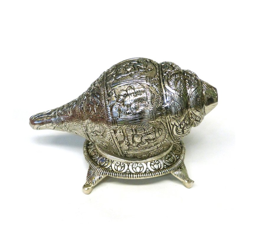 Silver Hand Engraved Dakshinavarti with a stand Silver Shankh with Dakshinavarti Carving, Decorative Showpiece