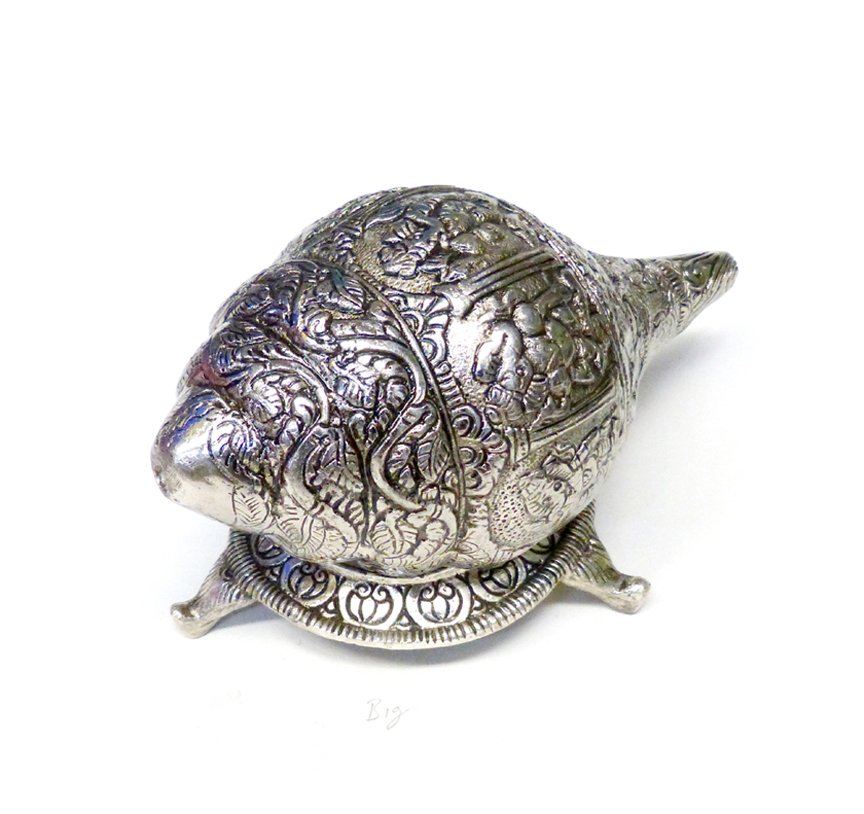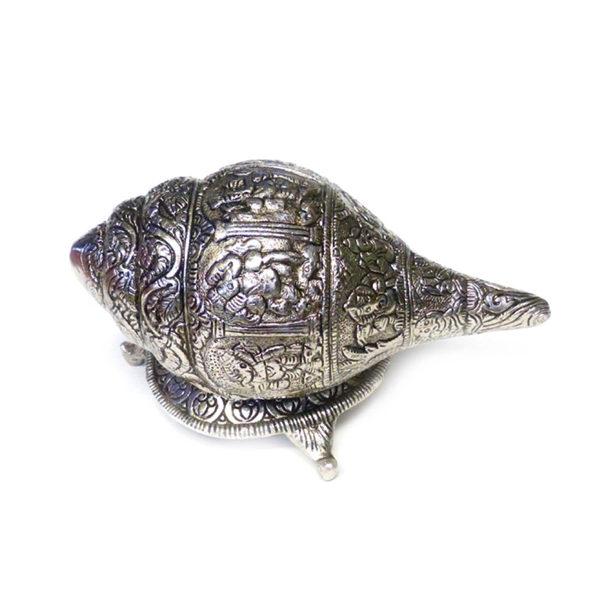 Silver decorative Dakshinavarti Shankh, often made from materials like brass or white metal and silver-plated.