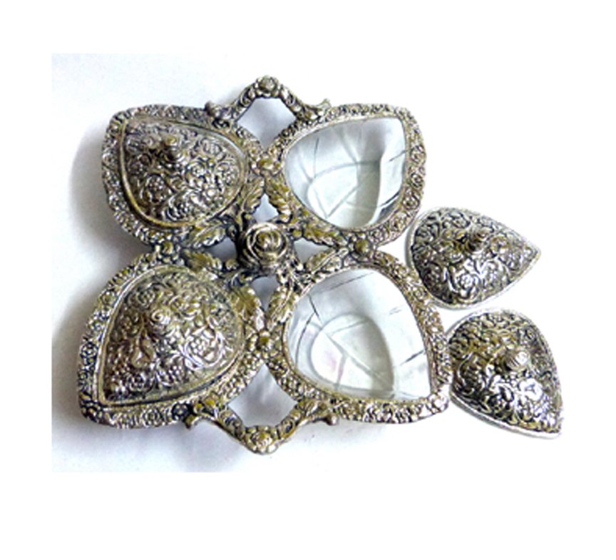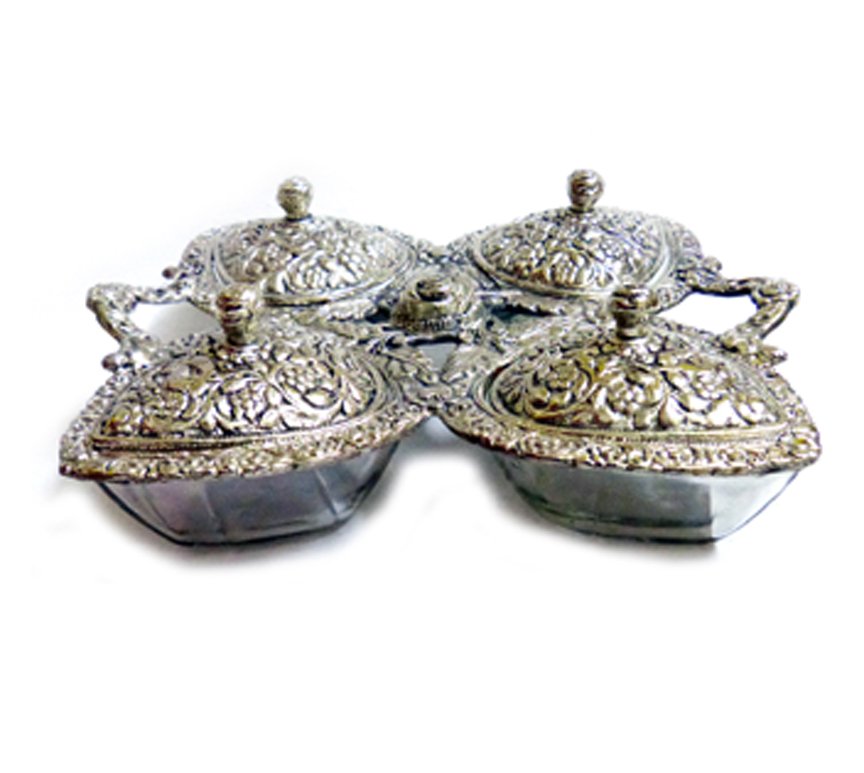 Silver Metal Silver Antique Tray With Four Glass Bowl
