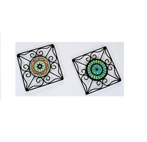 These are trivets, which are objects placed between a hot dish and a table or counter top to protect the surface from heat damage. They come in various materials like silicone, cork, wood, and metal. The trivets in the image have a decorative, patterned design and are likely made of metal with ceramic inserts. They are used to prevent burns, scorch marks, and discoloration on surfaces. Trivets can also serve as a barrier to prevent scratches from cookware.