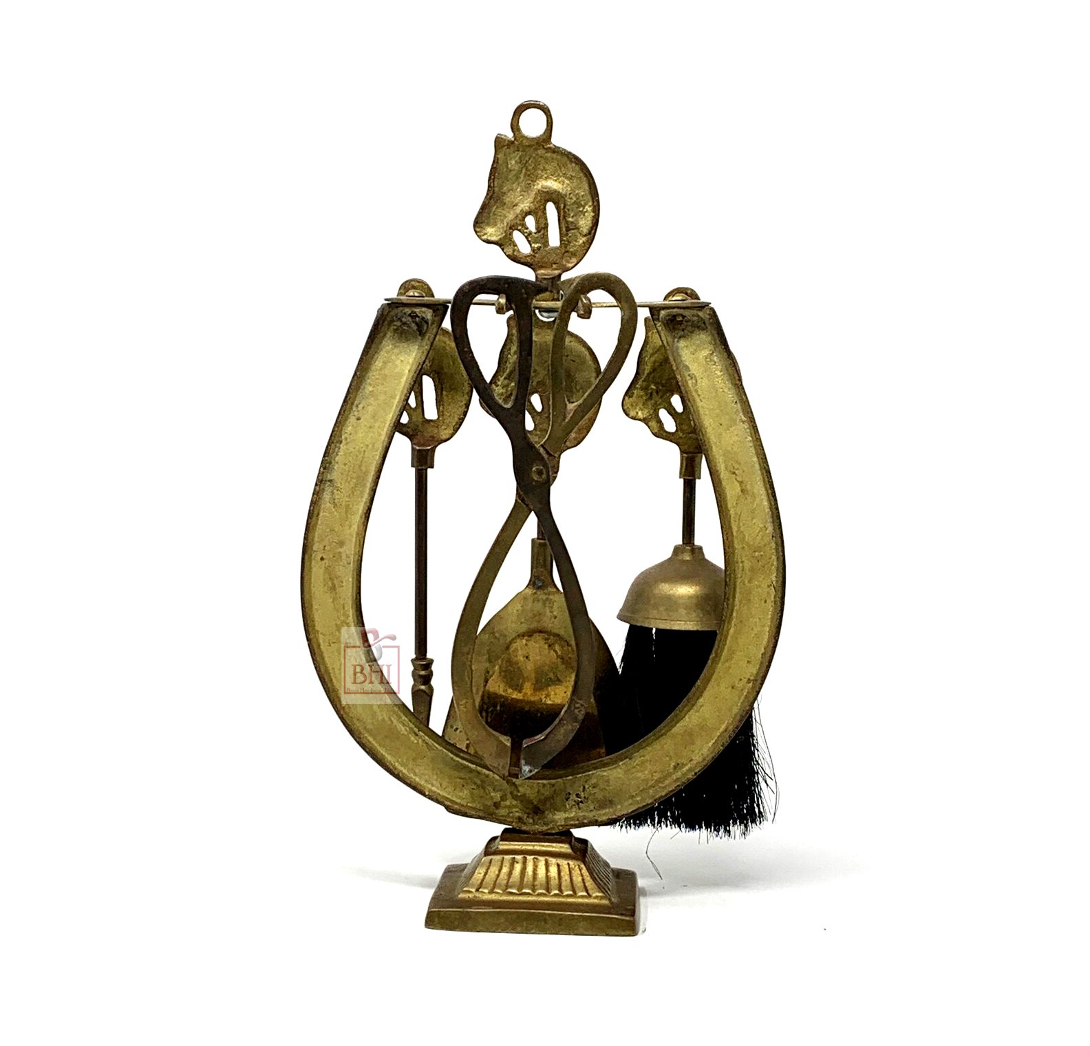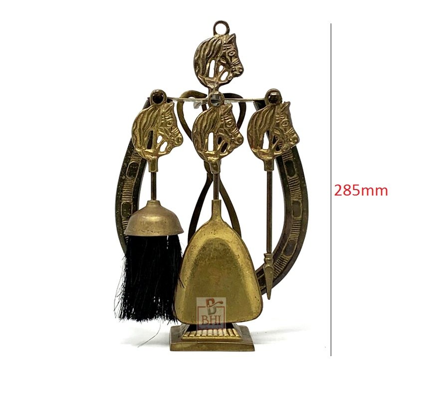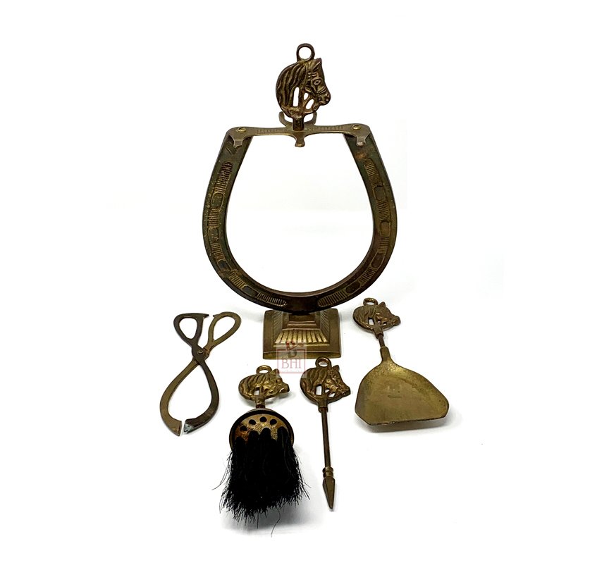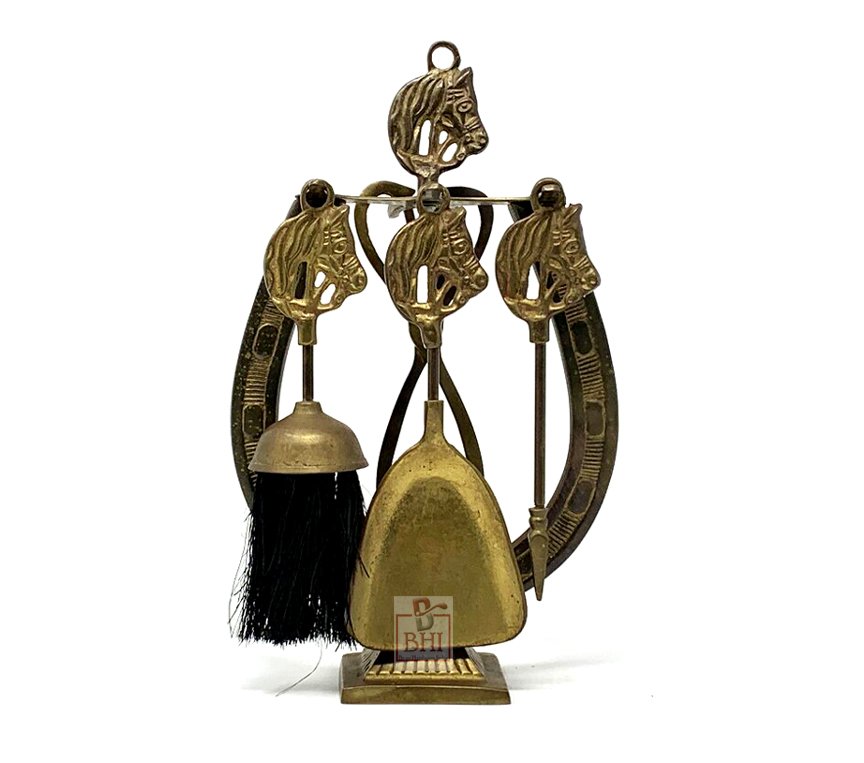 Vintage Brass Horse Head Fireplace 4 Tool Set With Horseshoe Stand.