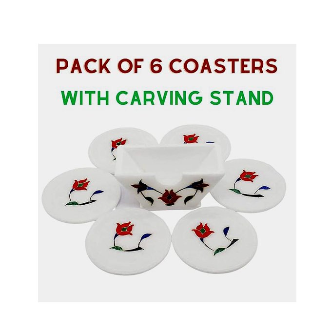 White Marble Stone Sangemarmar Coasters – Set of 6 Marble Coasters for Dining Table – White Marble Tea Coaster with Stand – Home Decor and Kitchen Accessories (Stand Coaster Set)