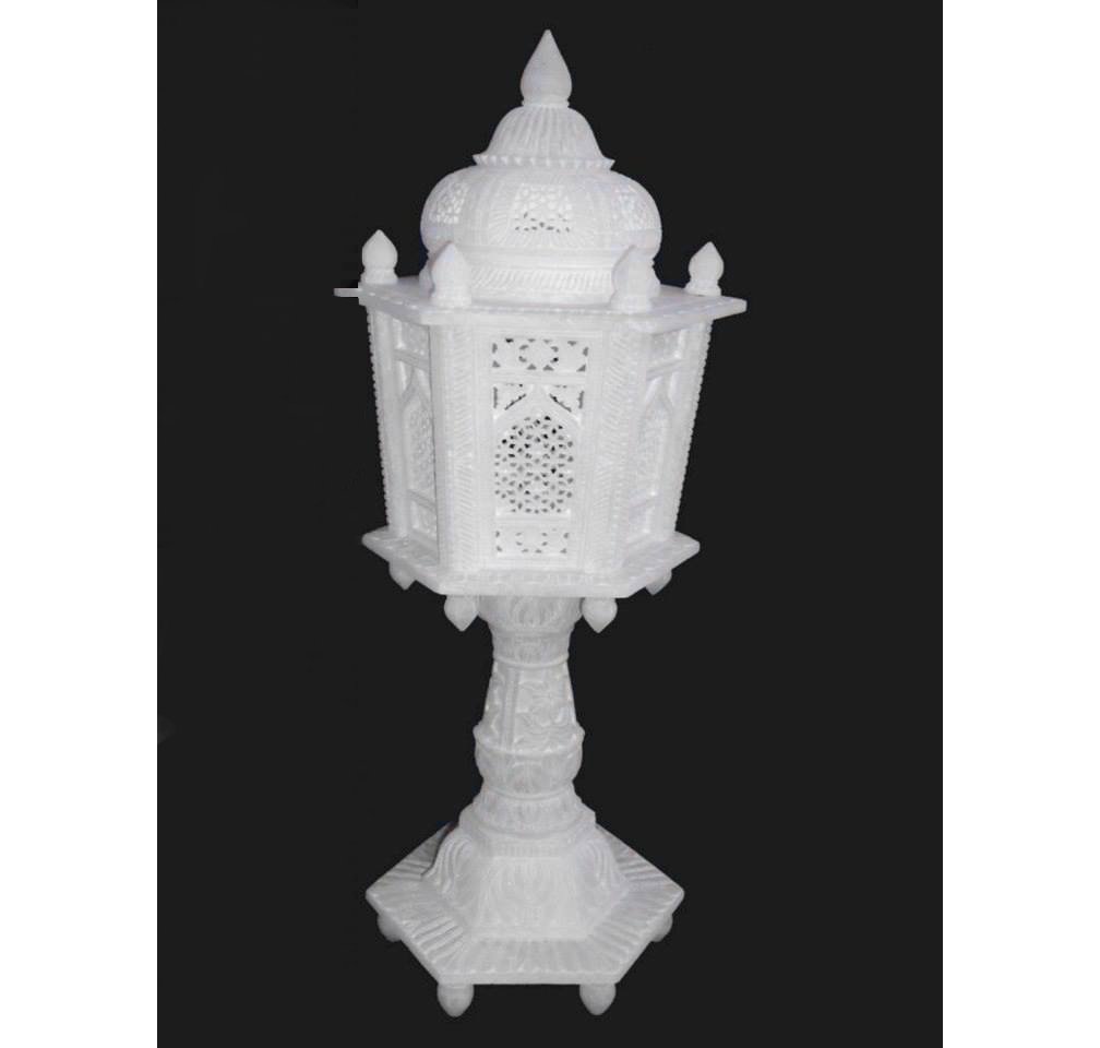 White Marble Stone Sangemarmar Inlay work Decorative White marble lamp, possibly a decorative table lamp or a garden lamp. These lamps are often handcrafted and may feature intricate carvings or inlay work. Marble lamps are used for home decor and can be a gift for loved ones. They are available in various designs and sizes, with some featuring LED lighting for a warm glow.