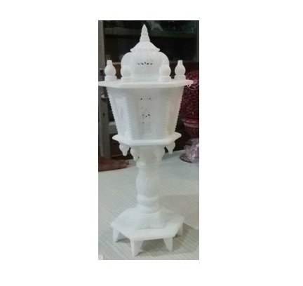 This appears to be a white marble lamp with intricate carvings. These types of lamps are often used for decorative purposes and can be found in homes or temples. The lamp has a pedestal base and a tiered structure with a pointed top. Marble is a popular material for such lamps due to its durability and elegant appearance. These lamps can come in various designs and sizes, and are often handcrafted.