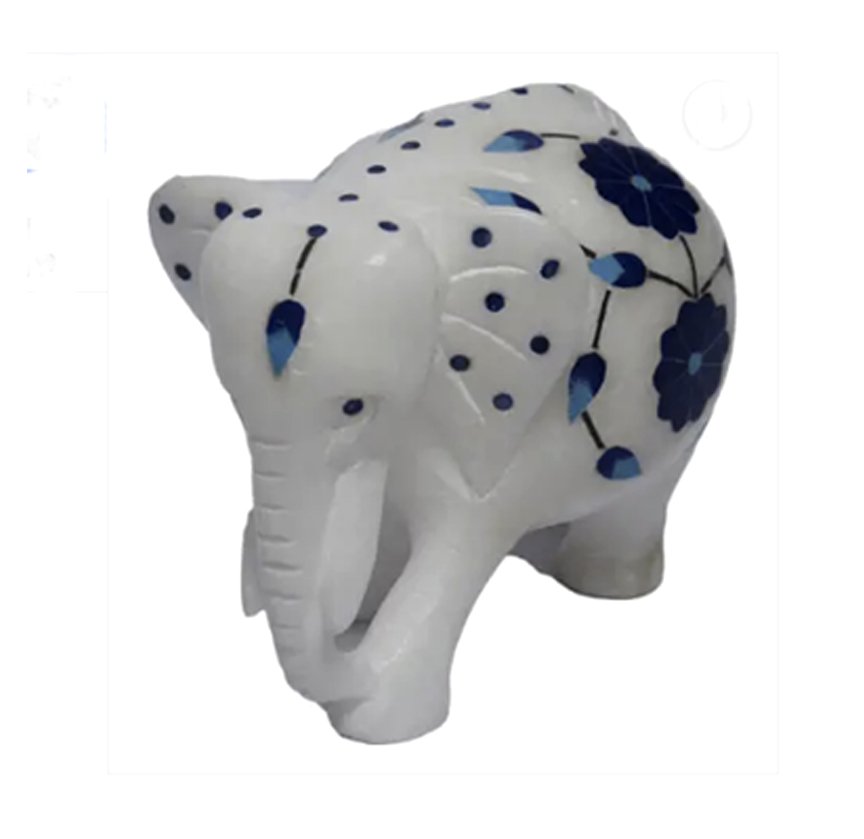 This is a marble elephant figurine with inlay work, likely from the Agra region of India. The elephant is a popular decorative item and is often seen as a symbol of good luck, strength, and wisdom. The inlay work is a traditional craft where semi-precious stones are carefully set into marble, creating intricate designs.