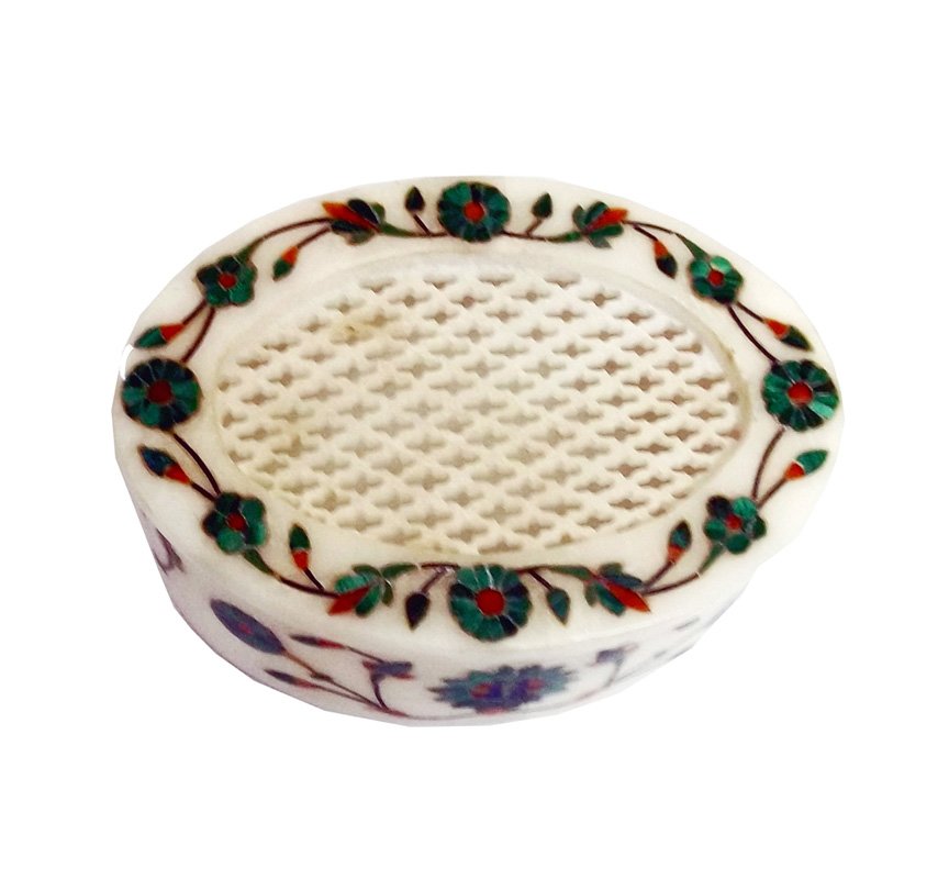 This is a White Marble Stone Sangemarmar jewellery box, often featuring inlay work with various semi-precious stones. These boxes are handcrafted by artisans in India and can be used to store jewelry, rings, or other small valuables. The inlay work involves precisely cutting and fitting colored stones into the marble. These boxes are available in different shapes, sizes, and designs. In addition to jewellery, these boxes can also be used for other small items.