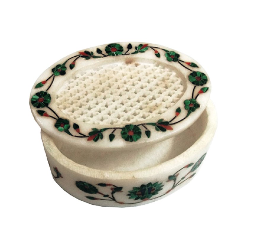 This marble jewellery box is a decorative item made from white marble and inlaid with semi-precious stones. It is used for storing jewellery, small trinkets, or other personal items. It is also used as a home decor item.