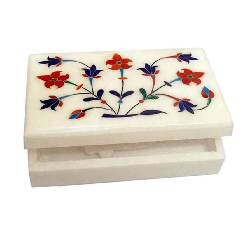 This is a white marble box with floral inlay work, often used for storing jewellery or as a decorative item. It is handmade and can be used for wedding or birthday gifts. The box is made from marble with semiprecious stones inlaid by hand. The inlay work consists of cutting and engraving marble shapes, then filling the grooves with the precisely cut pieces. The box is polished to bring out the natural shine of the marble and stones.