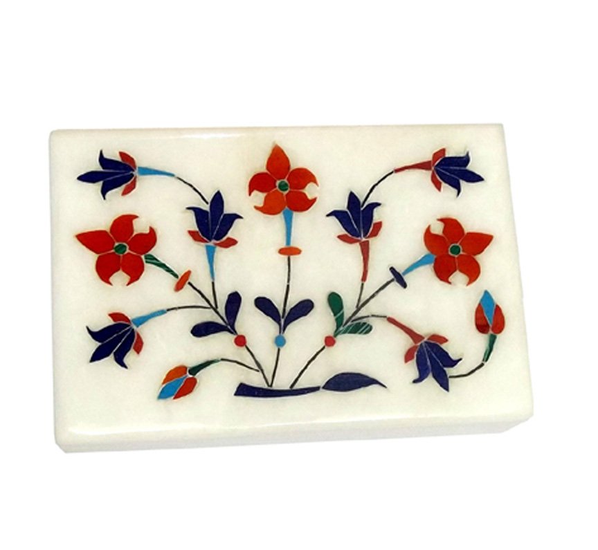 This is a Marble Jewellery Box with semi-precious stone inlay work. The box has a rectangular shape and is made of white marble with floral designs This type of inlay work is a traditional craft from Uttar Pradesh, India, with origins dating back to the Mughal era. The box can be used to store jewellery or other small items and is a decorative piece that adds elegance to any space.