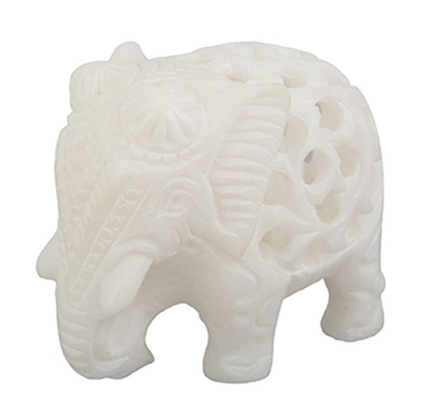 This is a hand-carved marble elephant figurine, featuring an intricate jali (openwork) design. The carving reveals a smaller elephant inside the larger one. The elephant is a symbol of patience, strength, and wisdom. These figurines are often used as decorative showpieces in homes, gardens, or meditation areas. They are crafted from materials like marble, alabaster, or soapstone. The detailed carving is done by skilled artisans, often from Agra, India.