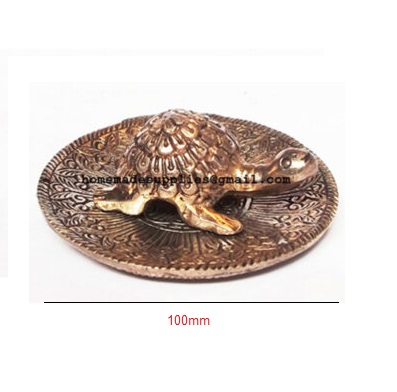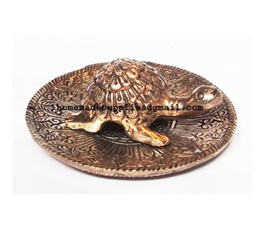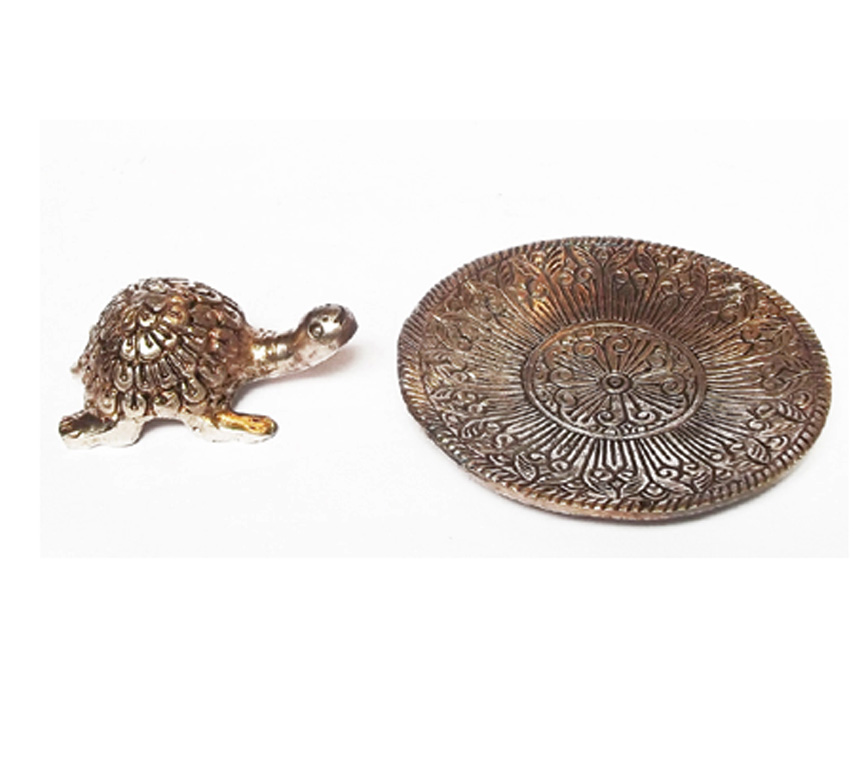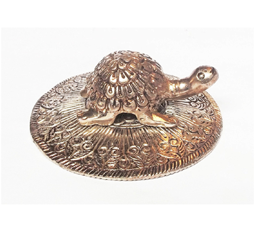 Brass Plate which holds Tortoise has floral and leaf pattern Brass metallic border The metal Tortoise is crafted with perfection and has a numeric pattern engraved on the bottom inner side which is considered to be very auspicious and brings wealth. The plate is not meant to be filled with water.Tortoise has a long life and hence it denotes Long life. The Turtoise or the Kachua represents the maximum age and longevity, stability, determination and will power Metal Turtle works as an aid in feng shui as it has power to balance and harmonize the environment around us.