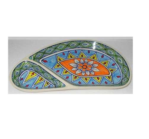 This is a Ceramic Chips n Dip Serving Tray, designed for serving chips and dips together.It features a divided design with a larger section for chips and a smaller section for dip, making it convenient for entertaining. The tray is often made from ceramic or similar materials and comes in various decorative patterns, like the one shown in the image with its colourful geometric and floral design.